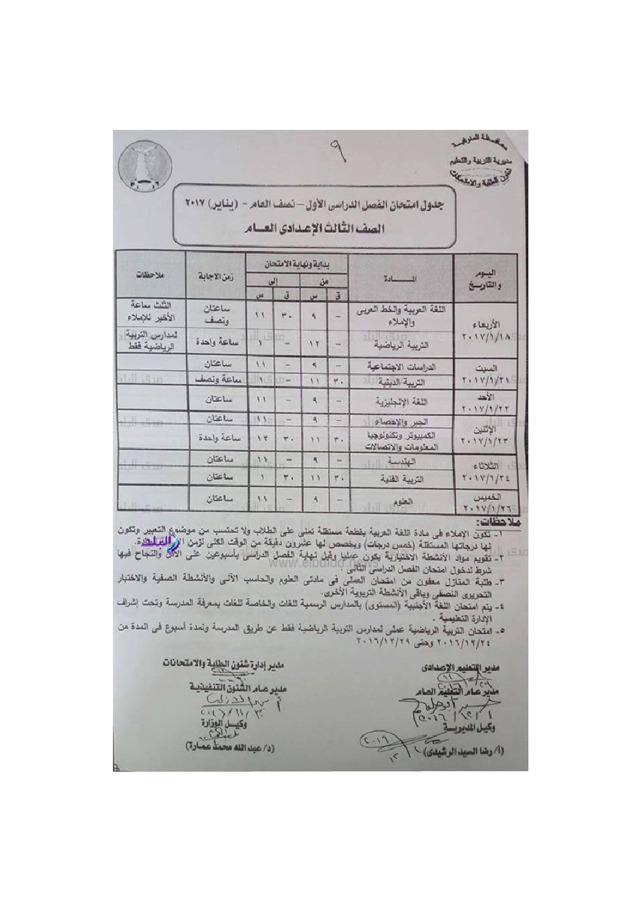 جدول امتحانات إعدادية المنوفية للعام الدراسي 2017 الفصل الدراسي الاول